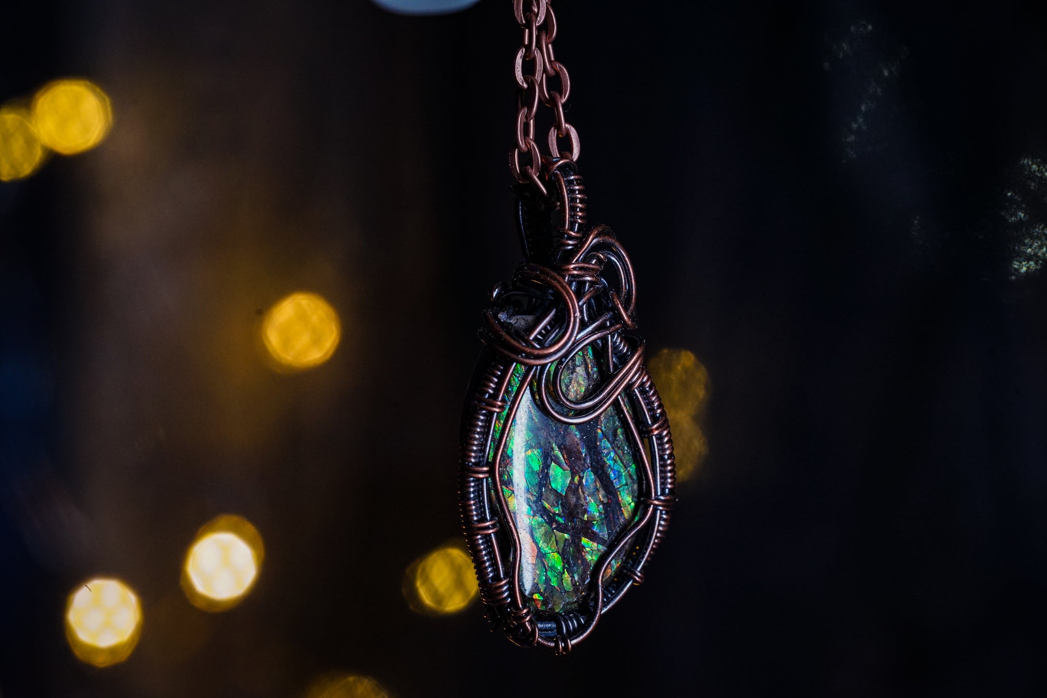 This playful Ammolite Copper Wire Wrap showcases a flashy ammolite gemstone, known for its vibrant, opal-like colors and organic origin from the eastern slopes of the Rocky Mountains. Wrapped in oxidized copper wire, the design highlights the stone’s natural brilliance with a bold, artistic twist. Ammolite is known to bring protection and abundance, as well as enhancing creativity and clarity.